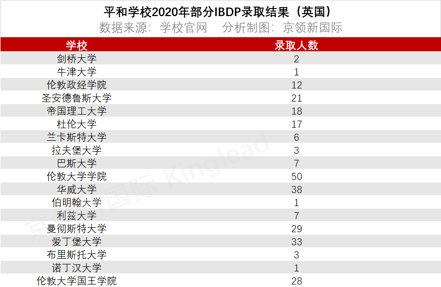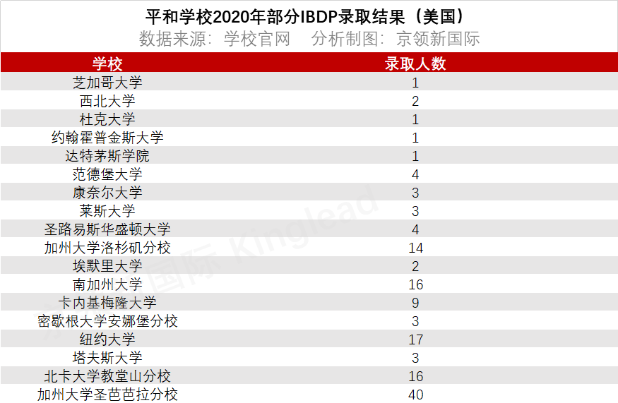 2020年,平和学校的IBDP课程班更是表现优异,100%的美本方向毕业生收获了U.S.News美国综合性大学前60的录取通知书。在主申英美方向,约82.5%的同学收到了U.S.News美国综合性大学前30、美国文理学院前20或英国G5大学的录取通知书。其中包括:剑桥大学、牛津大学、芝加哥大学、杜克大学、西北大学、约翰霍普金斯大学、达特茅斯学院、康奈尔大学、加州大学伯克利分校、阿默斯特学院、斯沃斯莫尔学院、韦尔斯利学院和鲍登学院等顶尖名校。